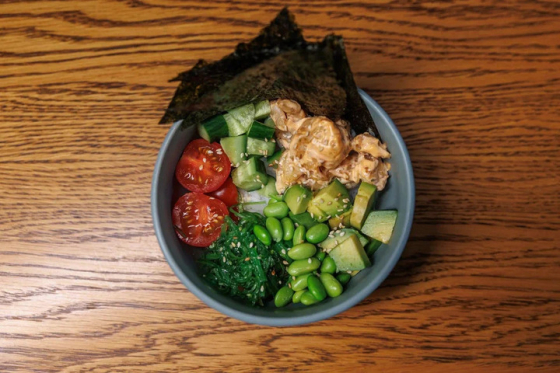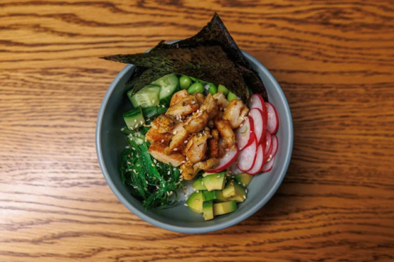 рис, авокадо, огурец, куриное филе, редис, чука, бобы, кунжут