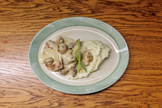 говяжья вырезка, шампиньоны, лук красный, сливочный соус. подаётся с пюре