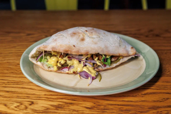 лепешка, свиная вырезка, романо, лук красный , огурцы маринованные, майонез, горчичный соус