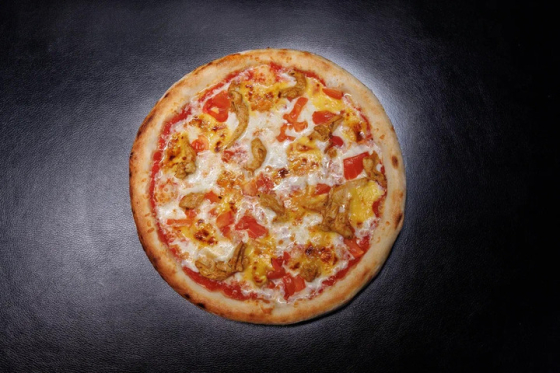 томатная основа, сыр моцарелла, куриное филе, бекон, пепперони, шампиньоны, томат, сыр пармезан